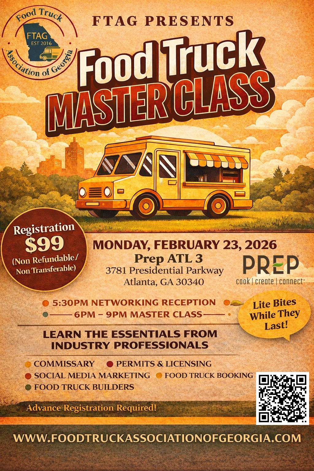 Hosted by the Food Truck Association of Georgia (FTAG), this master class brings together experienced industry professionals to walk attendees through the essential building blocks of food truck success—from startup requirements to daily operations and long-term growth strategies.